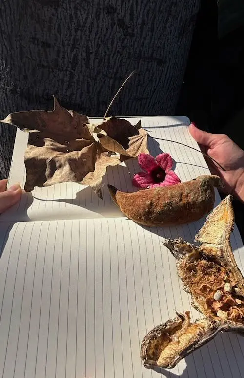 This partly deciduous tree has showy deep pink or red flowers, which along with the fruit are covered in a dense rusty velvet. Its blue green leaves are narrower than gt;B. acerifoliusgt; and whitish on underside.