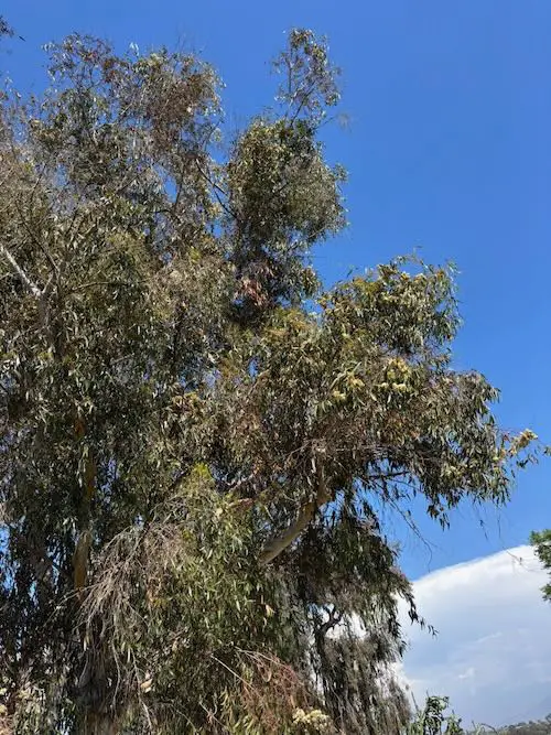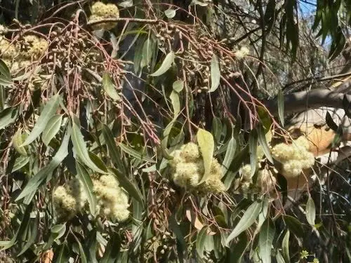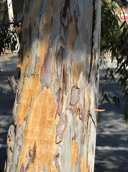 This tree is known for its striking, smooth bark that peels away in patches to reveal a mosaic of cream, grey, and brown underneath. It grows tall and straight, providing ample shade with its dense canopy of narrow, elongated leaves. The foliage emits a pleasant, aromatic scent, especially noticeable on warm days. During the flowering season, it produces clusters of small, creamy-white blossoms that attract a variety of pollinators, including bees and birds. This tree is drought-tolerant and thrives in well-drained soils, making it a resilient choice for urban landscapes.