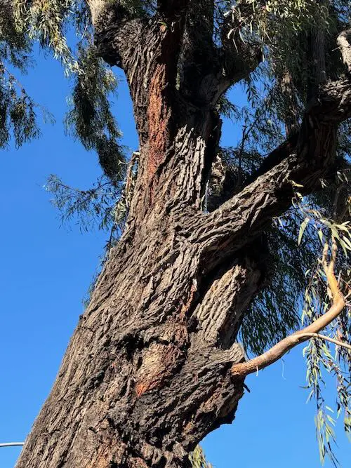 This tree features a striking, rough bark that ranges in color from dark brown to black, providing a dramatic contrast to its slender, blue-green leaves. It produces clusters of small, cream-colored to pink flowers that attract bees and birds, adding a lively touch to urban landscapes. Its branches have a graceful, slightly drooping habit, creating a soft, cascading effect. This tree is well-suited for dry climates, thriving in full sun and requiring minimal water once established. Its resilience and unique appearance make it a popular choice for parks and large gardens.