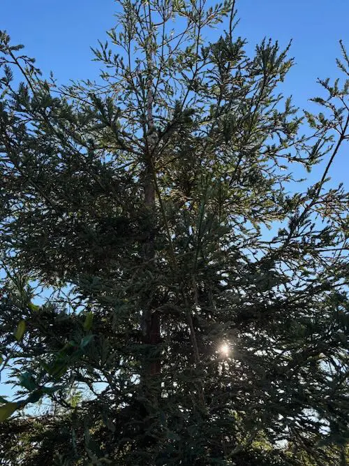 Schoolyard Use: This towering tree has thick, reddish-brown bark that can be used to discuss bark texture and fire resistance. Its needle-like leaves are evergreen and arranged in flat sprays, providing a year-round example of photosynthesis. The tree produces small, woody cones that can be used to illustrate seed dispersal and growth cycles. Its impressive height and longevity make it ideal for lessons on forest ecosystems and the importance of conservation.